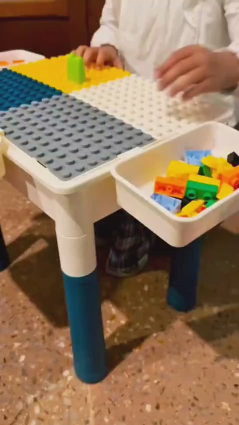 Su diseño multifuncional permite jugar, construir, dibujar, comer o estudiar, adaptándose a cualquier momento del día. Incluye más de 100 bloques de construcción tipo Lego compatibles y dos sillas cómodas y seguras.